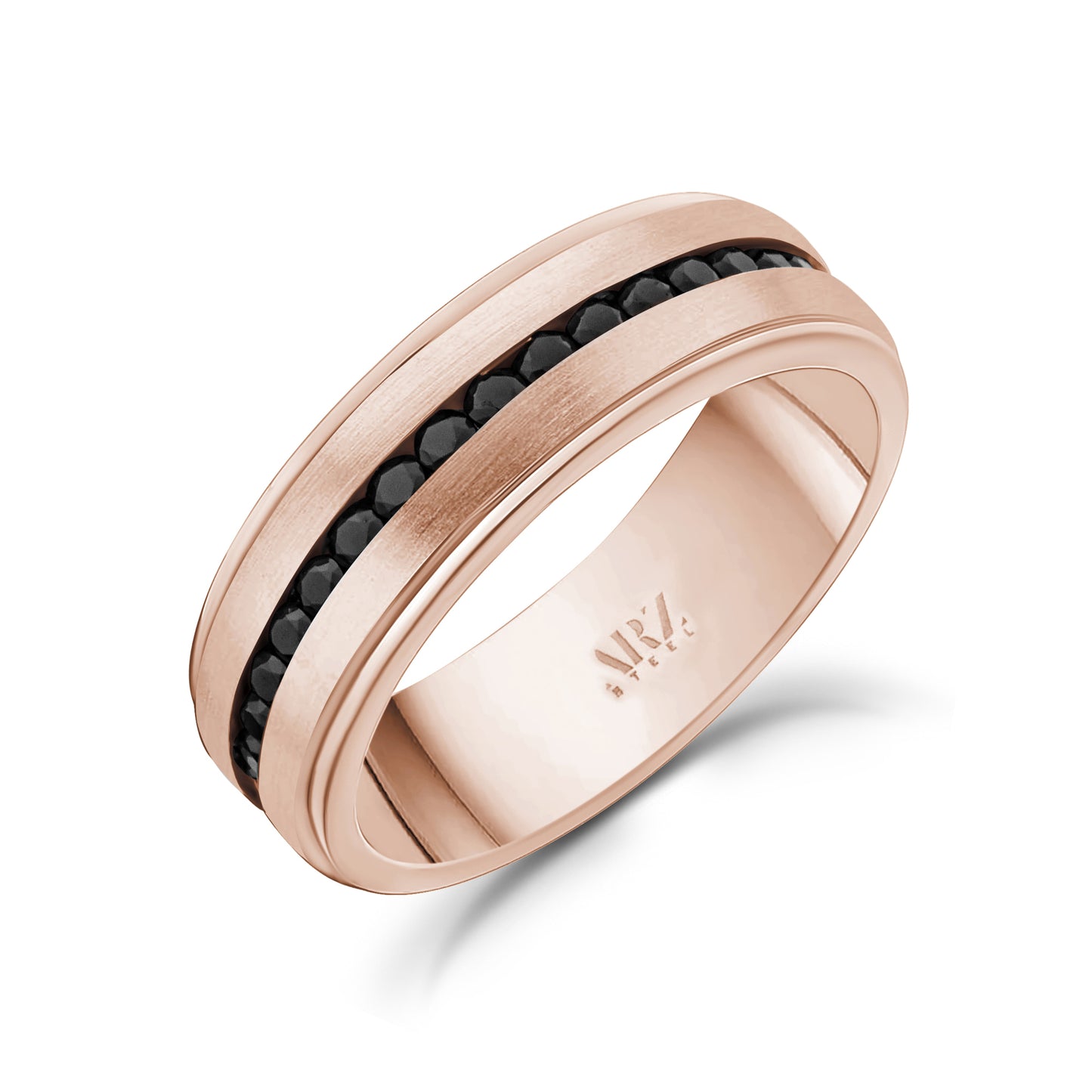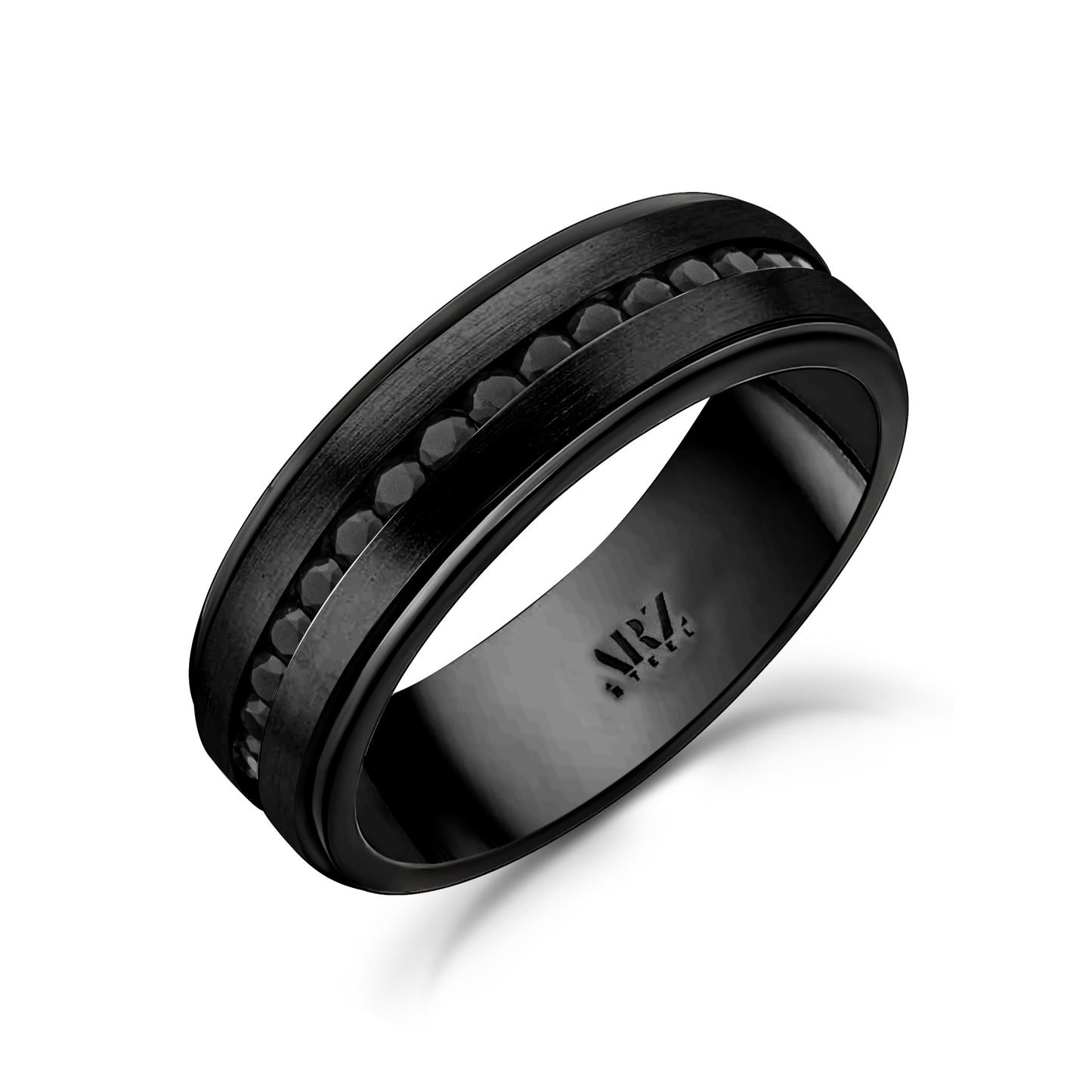 Dieses Produkt ist ein Ehering für den modernen Mann. Der Ring ist aus robustem Edelstahl gefertigt und verfügt über eine elegante, matte Oberfläche und eine Reihe schwarzer Zirkoniasteine. Er bietet einen sauberen und raffinierten Look und kann mit der von Ihnen gewählten Gravur angepasst werden. Der Ring ist 7 mm breit und 2,5 mm dick und wird in einer US-Standardgröße mit bequemer Passform geliefert.